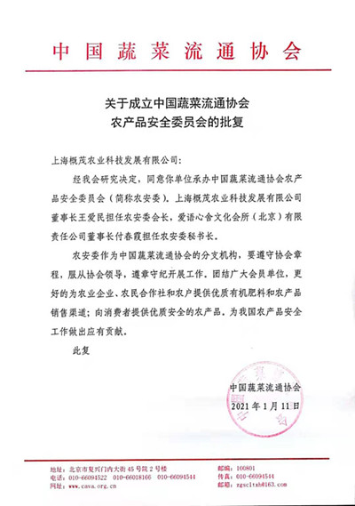 1月11日,經(jīng)過數(shù)月的準(zhǔn)備與醞釀,中國蔬菜流通協(xié)會(huì)正式批準(zhǔn)成立中國蔬菜流通協(xié)會(huì)農(nóng)產(chǎn)品安全委員會(huì)(簡(jiǎn)稱農(nóng)安委,CVMA Farm Produce Safety Committee)。農(nóng)安委由上海概茂農(nóng)業(yè)科技發(fā)展有限公司承擔(dān)管理,其致力于提高國內(nèi)農(nóng)產(chǎn)品品質(zhì)、保障農(nóng)產(chǎn)品安全、開拓農(nóng)產(chǎn)品銷售渠道、為消費(fèi)者提供安全優(yōu)質(zhì)的農(nóng)產(chǎn)品。上海概茂農(nóng)業(yè)科技發(fā)展有限公司董事長(zhǎng)王愛民任農(nóng)安委會(huì)長(zhǎng)。為方便協(xié)會(huì)工作,農(nóng)安委秘書處設(shè)在愛語心舍文化會(huì)所(北京)有限責(zé)任公司,董事長(zhǎng)付春霞擔(dān)任農(nóng)安委秘書長(zhǎng),主要負(fù)責(zé)農(nóng)安委日常工作。